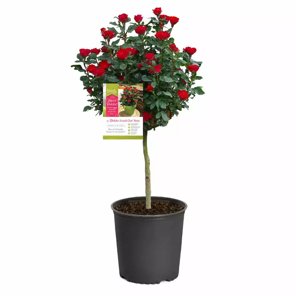 Give your patio or garden a boost of vibrant red color with the Petite Knock Out Rose tree. This miniature tree has a compact size, allowing it to fit in small gardens and patio pots.